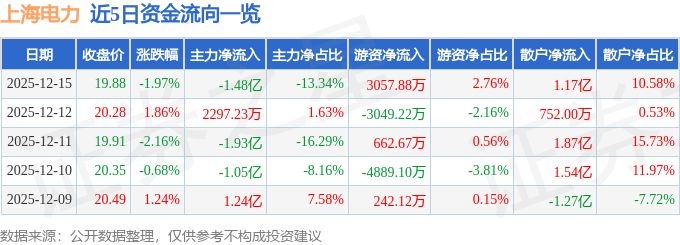 证券之星消息,截至2025年12月15日收盘,上海电力(600021)报收于19.88元,下跌1.97%,换手率1.95%,成交量55.15万手,成交额11.08亿元。