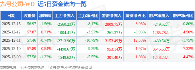 证券之星消息,截至2025年12月15日收盘,九号公司(689009)报收于56.97元,下跌1.56%,换手率0.98%,成交量5.43万手,成交额3.14亿元。