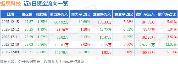 证券之星消息,截至2025年12月15日收盘,钜泉科技(688391)报收于27.87元,下跌1.35%,换手率1.06%,成交量1.22万手,成交额3414.21万元。