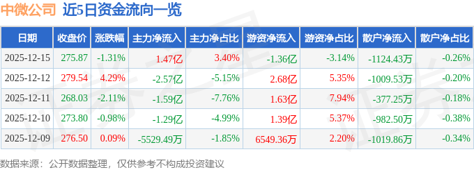 证券之星消息,截至2025年12月15日收盘,中微公司(688012)报收于275.87元,下跌1.31%,换手率2.45%,成交量15.36万手,成交额43.25亿元。