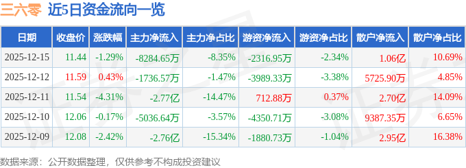 证券之星消息,截至2025年12月15日收盘,三六零(601360)报收于11.44元,下跌1.29%,换手率1.23%,成交量86.36万手,成交额9.92亿元。