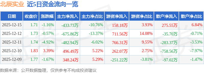 证券之星消息,截至2025年12月15日收盘,北辰实业(601588)报收于1.71元,下跌1.16%,换手率0.88%,成交量23.44万手,成交额4029.49万元。