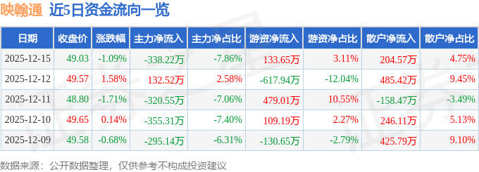 12月15日的资金流向数据方面,主力资金净流出338.22万元,占总成交额7.86%,游资资金净流入133.65万元,占总成交额3.11%,散户资金净流入204.57万元,占总成交额4.75%。