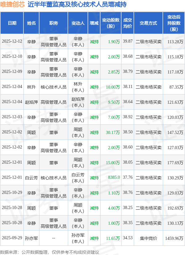 唯捷创芯近半年内的董监高及核心技术人员增减持详情如下: