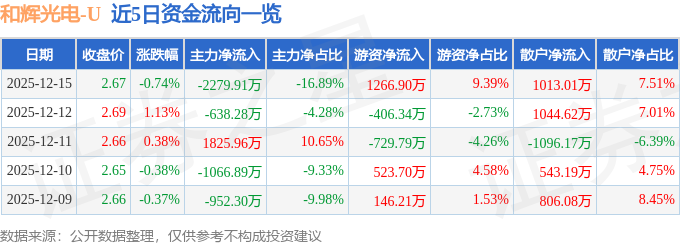12月15日的资金流向数据方面,主力资金净流出2279.91万元,占总成交额16.89%,游资资金净流入1266.9万元,占总成交额9.39%,散户资金净流入1013.01万元,占总成交额7.51%。