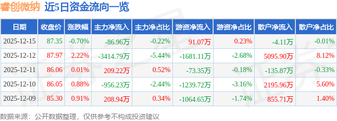 证券之星消息,截至2025年12月15日收盘,睿创微纳(688002)报收于87.35元,下跌0.7%,换手率0.96%,成交量4.43万手,成交额3.88亿元。