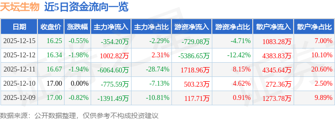 证券之星消息,截至2025年12月15日收盘,天坛生物(600161)报收于16.25元,下跌0.55%,换手率0.48%,成交量9.54万手,成交额1.55亿元。