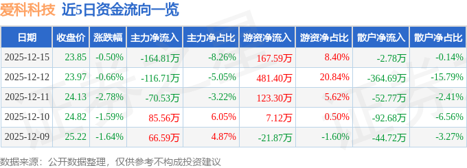 12月15日的资金流向数据方面,主力资金净流出164.81万元,占总成交额8.26%,游资资金净流入167.59万元,占总成交额8.4%,散户资金净流出2.78万元,占总成交额0.14%。