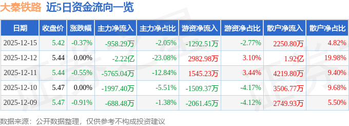 证券之星消息,截至2025年12月15日收盘,大秦铁路(601006)报收于5.42元,下跌0.37%,换手率0.43%,成交量86.18万手,成交额4.67亿元。