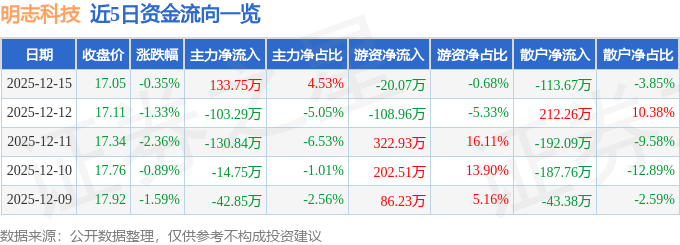 证券之星消息,截至2025年12月15日收盘,明志科技(688355)报收于17.05元,下跌0.35%,换手率1.4%,成交量1.74万手,成交额2952.99万元。