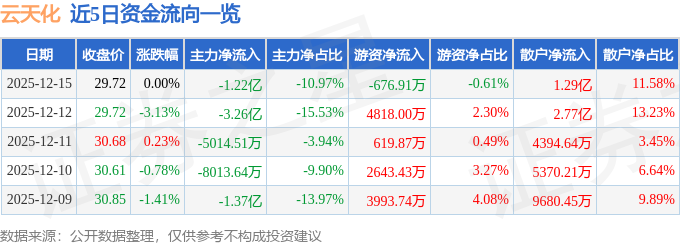 证券之星消息,截至2025年12月15日收盘,云天化(600096)报收于29.72元,上涨0.0%,换手率2.05%,成交量37.33万手,成交额11.12亿元。