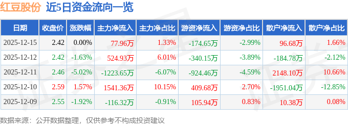 证券之星消息,截至2025年12月15日收盘,红豆股份(600400)报收于2.42元,上涨0.0%,换手率1.06%,成交量24.23万手,成交额5840.6万元。