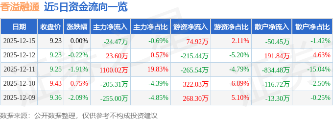证券之星消息,截至2025年12月15日收盘,香溢融通(600830)报收于9.23元,上涨0.0%,换手率0.85%,成交量3.85万手,成交额3557.63万元。