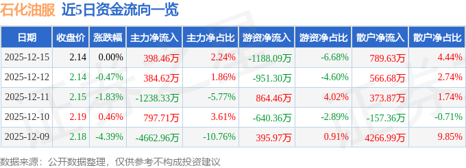 证券之星消息,截至2025年12月15日收盘,石化油服(600871)报收于2.14元,上涨0.0%,换手率0.61%,成交量83.07万手,成交额1.78亿元。