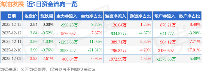 证券之星消息,截至2025年12月15日收盘,海油发展(600968)报收于3.84元,上涨0.0%,换手率0.26%,成交量26.66万手,成交额1.03亿元。