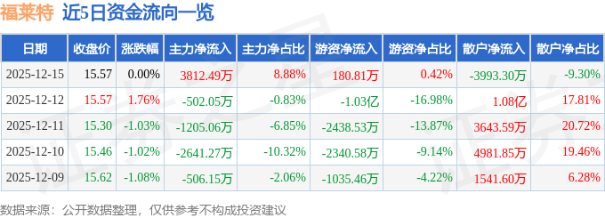 12月15日的资金流向数据方面,主力资金净流入3812.49万元,占总成交额8.88%,游资资金净流入180.81万元,占总成交额0.42%,散户资金净流出3993.3万元,占总成交额9.3%。