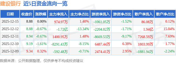 证券之星消息,截至2025年12月15日收盘,建设银行(601939)报收于8.88元,上涨0.0%,换手率0.82%,成交量78.22万手,成交额6.97亿元。