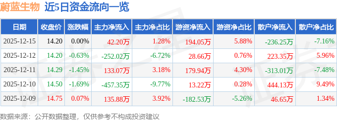 证券之星消息,截至2025年12月15日收盘,蔚蓝生物(603739)报收于14.2元,上涨0.0%,换手率0.92%,成交量2.32万手,成交额3299.03万元。