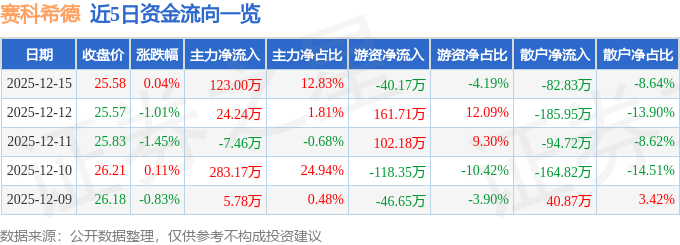 12月15日的资金流向数据方面,主力资金净流入123.0万元,占总成交额12.83%,游资资金净流出40.17万元,占总成交额4.19%,散户资金净流出82.83万元,占总成交额8.64%。