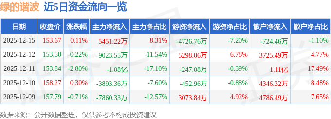 12月15日的资金流向数据方面,主力资金净流入5451.22万元,占总成交额8.31%,游资资金净流出4726.76万元,占总成交额7.2%,散户资金净流出724.46万元,占总成交额1.1%。