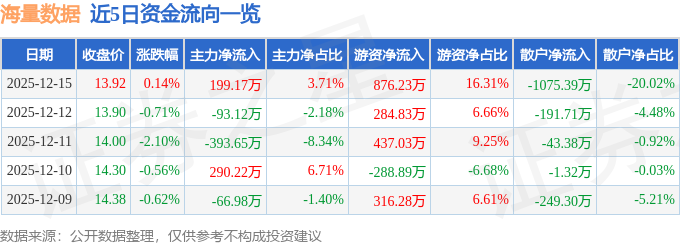 证券之星消息,截至2025年12月15日收盘,海量数据(603138)报收于13.92元,上涨0.14%,换手率1.34%,成交量3.86万手,成交额5371.32万元。