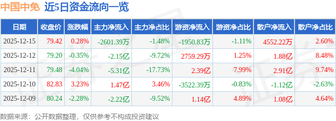 证券之星消息,截至2025年12月15日收盘,中国中免(601888)报收于79.42元,上涨0.28%,换手率1.13%,成交量22.05万手,成交额17.52亿元。