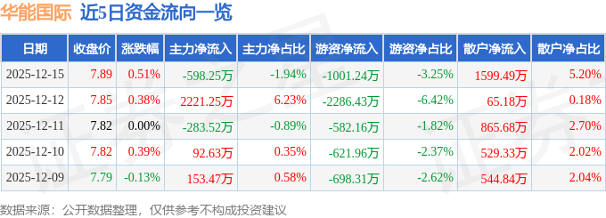 证券之星消息,截至2025年12月15日收盘,华能国际(600011)报收于7.89元,上涨0.51%,换手率0.35%,成交量39.0万手,成交额3.08亿元。