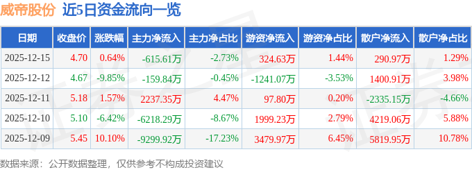 证券之星消息,截至2025年12月15日收盘,威帝股份(603023)报收于4.7元,上涨0.64%,换手率8.58%,成交量47.87万手,成交额2.25亿元。