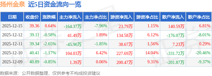 12月15日的资金流向数据方面,主力资金净流出164.37万元,占总成交额7.96%,游资资金净流入23.79万元,占总成交额1.15%,散户资金净流入140.59万元,占总成交额6.81%。