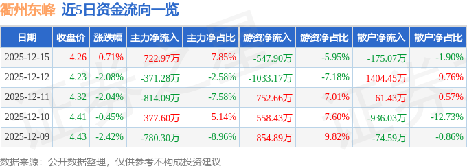 证券之星消息,截至2025年12月15日收盘,衢州东峰(601515)报收于4.26元,上涨0.71%,换手率1.17%,成交量21.72万手,成交额9212.91万元。