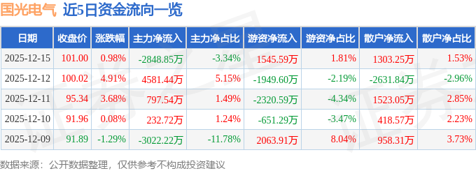 证券之星消息,截至2025年12月15日收盘,国光电气(688776)报收于101.0元,上涨0.98%,换手率7.86%,成交量8.51万手,成交额8.53亿元。