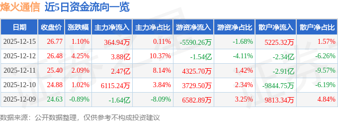 证券之星消息,截至2025年12月15日收盘,烽火通信(600498)报收于26.77元,上涨1.1%,换手率9.87%,成交量125.84万手,成交额33.25亿元。