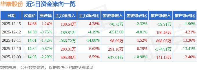 证券之星消息,截至2025年12月15日收盘,华康股份(605077)报收于14.68元,上涨1.24%,换手率0.69%,成交量2.08万手,成交额3054.75万元。