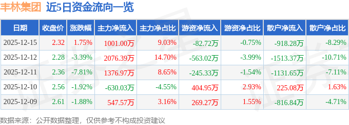 证券之星消息,截至2025年12月15日收盘,丰林集团(601996)报收于2.32元,上涨1.75%,换手率4.29%,成交量48.06万手,成交额1.11亿元。