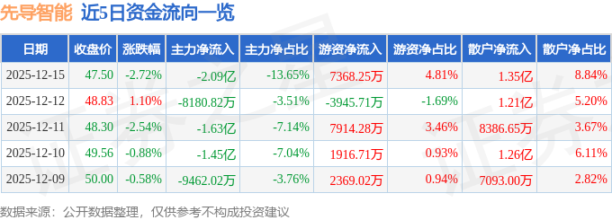12月15日的资金流向数据方面,主力资金净流出2.09亿元,占总成交额13.65%,游资资金净流入7368.25万元,占总成交额4.81%,散户资金净流入1.35亿元,占总成交额8.84%。