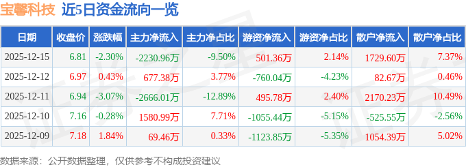 证券之星消息,截至2025年12月15日收盘,宝馨科技(002514)报收于6.81元,下跌2.3%,换手率6.21%,成交量34.41万手,成交额2.35亿元。