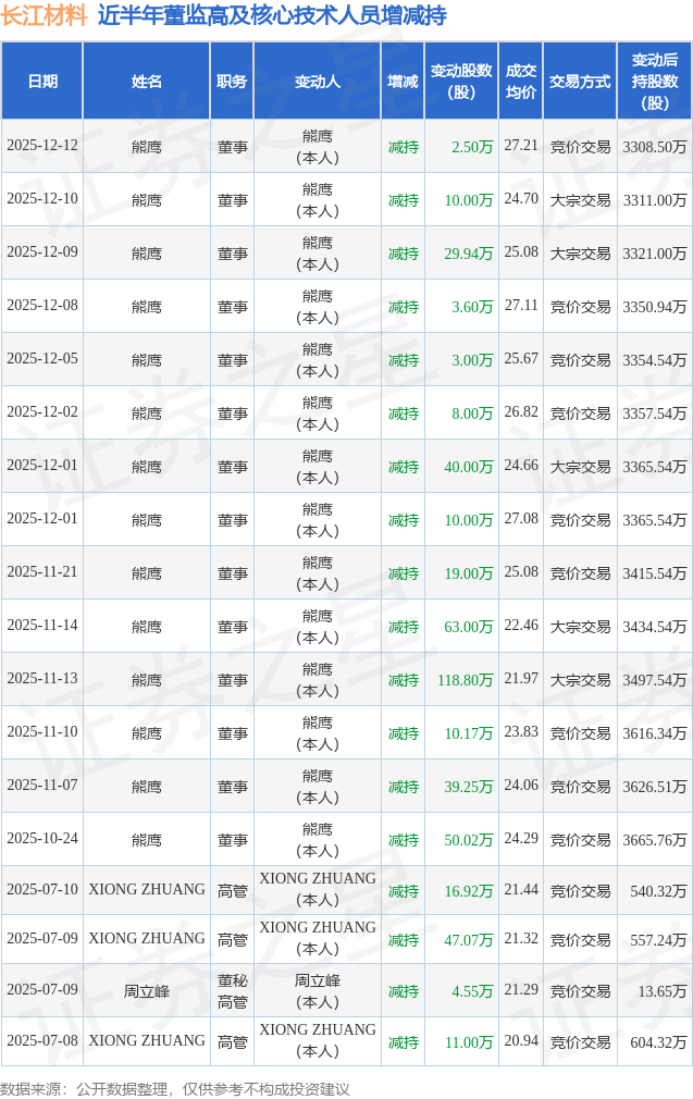 长江材料近半年内的董监高及核心技术人员增减持详情如下: