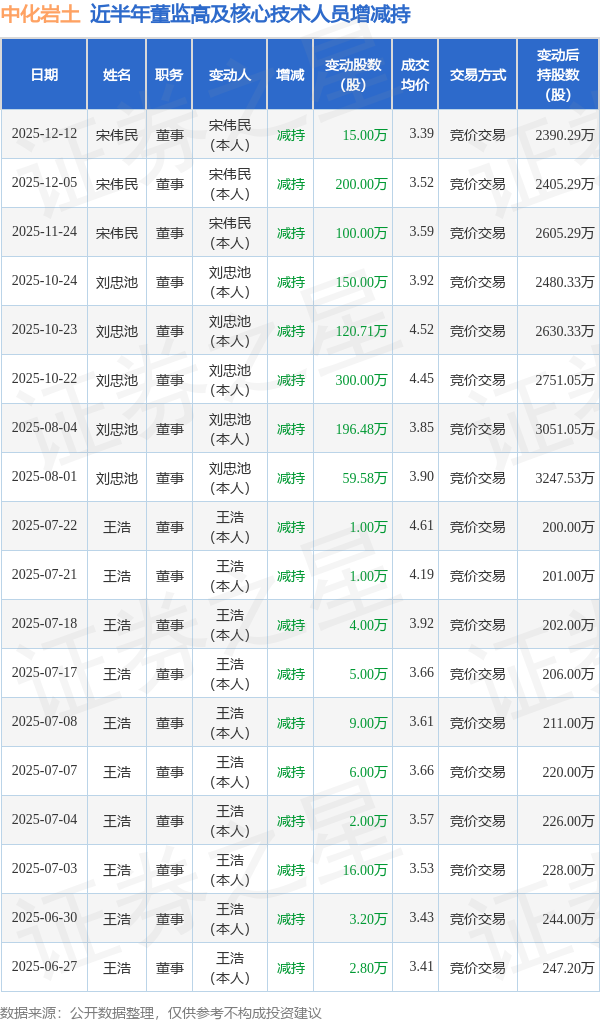中化岩土近半年内的董监高及核心技术人员增减持详情如下:
