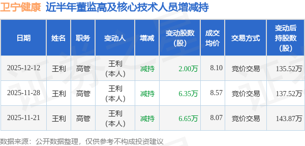 证券之星消息,根据12月15日市场公开信息、上市公司公告及交易所披露数据整理,卫宁健康(300253)最新董监高及相关人员股份变动情况:2025年12月12日公司高管王利共减持公司股份2.0万股,占公司总股本为0.0009%。变动期间公司股价下跌0.25%,12月12日当日收盘报8.09元。