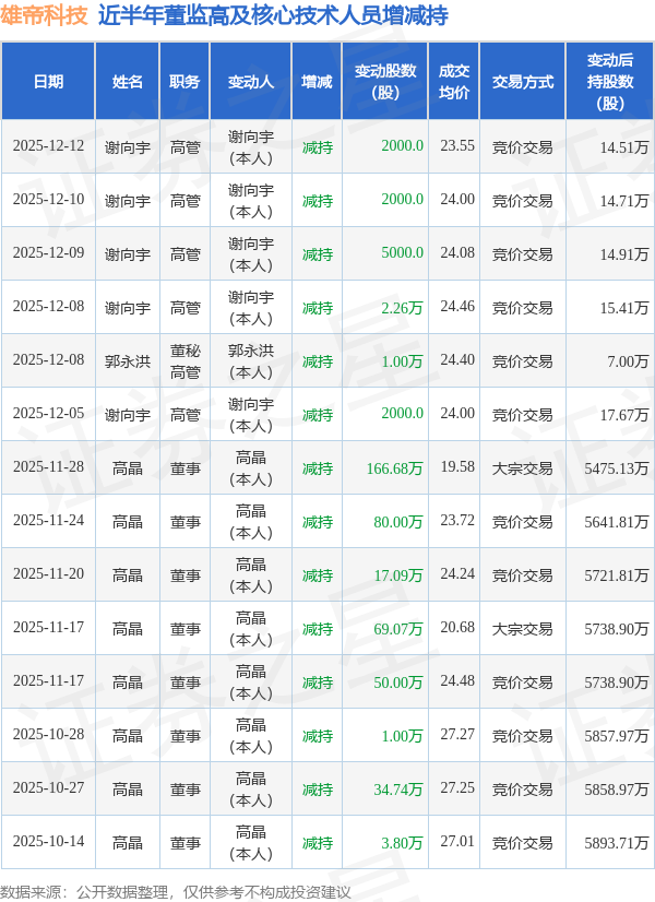 雄帝科技近半年内的董监高及核心技术人员增减持详情如下: