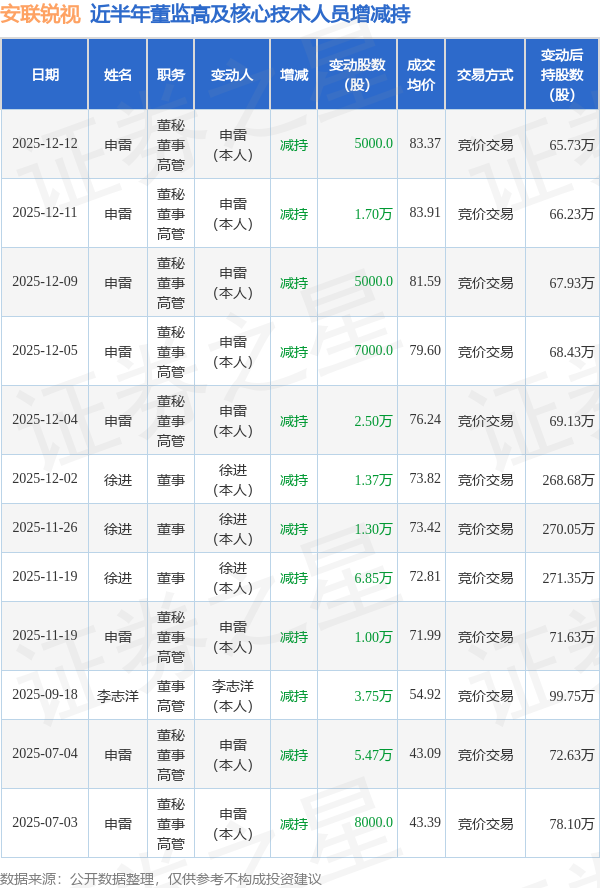 安联锐视近半年内的董监高及核心技术人员增减持详情如下: