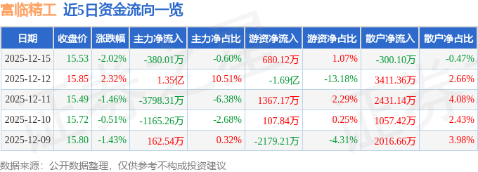证券之星消息,截至2025年12月15日收盘,富临精工(300432)报收于15.53元,下跌2.02%,换手率2.4%,成交量40.6万手,成交额6.37亿元。
