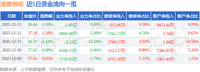 证券之星消息,截至2025年12月15日收盘,通富微电(002156)报收于36.44元,下跌1.99%,换手率1.96%,成交量29.69万手,成交额10.84亿元。