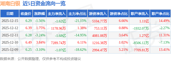 证券之星消息,截至2025年12月15日收盘,湖南白银(002716)报收于6.29元,下跌1.56%,换手率5.28%,成交量122.64万手,成交额7.67亿元。