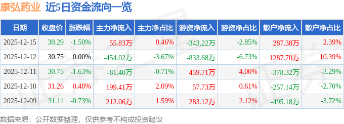 证券之星消息,截至2025年12月15日收盘,康弘药业(002773)报收于30.29元,下跌1.5%,换手率0.57%,成交量3.94万手,成交额1.2亿元。
