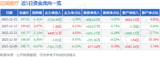 证券之星消息,截至2025年12月15日收盘,迈瑞医疗(300760)报收于197.01元,下跌1.41%,换手率0.41%,成交量4.95万手,成交额9.82亿元。