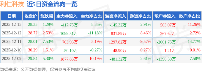 证券之星消息,截至2025年12月15日收盘,利仁科技(001259)报收于28.35元,下跌1.29%,换手率3.67%,成交量1.75万手,成交额5000.74万元。