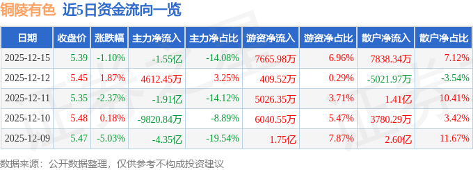 证券之星消息,截至2025年12月15日收盘,铜陵有色(000630)报收于5.39元,下跌1.1%,换手率1.83%,成交量203.61万手,成交额11.01亿元。