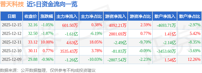 证券之星消息,截至2025年12月15日收盘,普天科技(002544)报收于32.16元,下跌1.05%,换手率7.11%,成交量48.36万手,成交额15.8亿元。