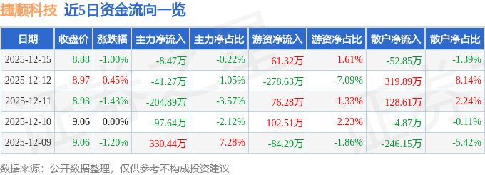 证券之星消息,截至2025年12月15日收盘,捷顺科技(002609)报收于8.88元,下跌1.0%,换手率0.93%,成交量4.27万手,成交额3809.24万元。